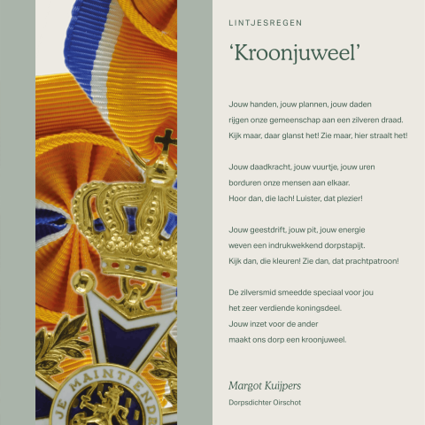 Op vrijdag 24 april was het weer zover: de jaarlijkse lintjesregen! Vier inwoners ontvingen een koninklijke onderscheiding voor hun jarenlange inzet en betrokkenheid bij onze gemeente. Zij werden in het zonnetje gezet door burgemeester Judith Keijzers-Verschelling, jeugdburgemeester Floor van Ruremonde, wethouders Joep van de Ven, Claud Leermakers en Paul van den Biggelaar én dorpsdichter Margot Kuijpers.