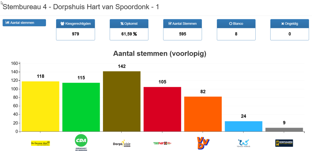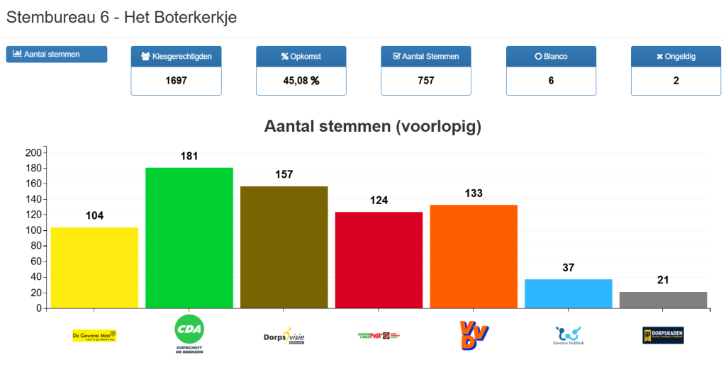 Vandaag konden alle inwoners van onze gemeente stemmen voor de gemeenteraadsverkiezingen. Op dit moment worden de stemmen geteld. De eerste voorlopige uitslagen per stembureau zijn inmiddels bekend. Deze vindt u hieronder. De overige resultaten volgen in de loop van de avond.
